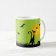Bats in the sky fly above a green-eyed black cat and leering jack o' lantern on this Halloween coffee mug. MATCHING items in our collection.
