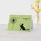 Black cat silhouette on green and white pin dots background with dandelion for Name Day.