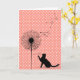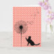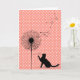 Black cat silhouette on orange and white polka dot pattern with dandelion seedlings for general birthday.