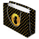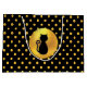 Beautiful gift bag with a black cat and golden polka dots on black background.