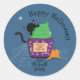 Some cute blue stickers featuring a black cat hiding behind a Halloween cupcake with a green icing . Personalise it with your name . Perfect to seal favour bags at a kids party .