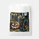 Halloween favour bag. Black Cat sitting on a front porch next to a carved pumpkin with a full moon in the background.