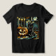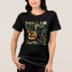 Halloween shirt. Black Cat sitting on a front porch next to a carved pumpkin with a full moon in the background.