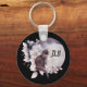 A key chain with a watercolor painting of a black cat and a light purple and pink floral bouquet. Standing in front a a large full moon. Stylish and magical.