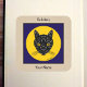 A retro-looking illustration of the face of a yellow-eyed black cat appears in a moon-like circle in this original Halloween-appropriate art by Richard H. Fay.