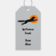 A custom tag with new vintage art of a black cat flying over the moon and custom retro script text on the front, and the back reads Black Cat Flying School in retro letters.