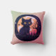 This cute and fun pink and green pillow sets the stage for a magical Halloween night. At its centre, a super cute black cat stands in silent contemplation, its vivid green eyes reflecting the enchanting world around it. The cat is surrounded by a mysterious forest, where the trees sway gently in the breeze, and their branches seem to whisper secrets. Above, a full moon casts a spell on the sky, painting it with hues of pink and orange, creating an otherworldly ambiance.