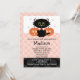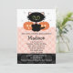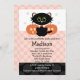These halloween birthday invitations for kids, tweens and teens are more girly than creepy. A cute black kitty with green eyes sits in in front of a pair of jack o'lanterns on a pink and black polk-a-dot background. Customise it to say whatever you want. Artwork and illustration © Chrissy H. Studios, LLC. All Rights Reserved.