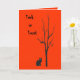 This Halloween card features a black cat under a bare black tree looking right out at you against a brilliant orange background. The image is repeated inside. All text is customizable.