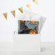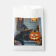 Halloween pumpkin carving party favour bags. Cute black cat in witch hat napping next to a pumpkin on the front porch.