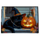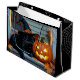 Halloween pumpkin carving party gift bag. Cute black cat in witch hat napping next to a pumpkin on the front porch.