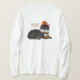 Black Cat Halloween Tee Shirt. The design is an illustrated black cat with blue eyes, pumpkins, spiders and webs. There is also a cute sign on the shirt. Thanks to Creative Fabrica and the Hungryjpeg for some of the elements in the design.