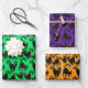 Black cat halloween wrapping paper set of 3 sheets, featuring a trendy cat pattern on a green, purple and orange colour backgrounds. For matching products please browse the Black Cat Halloween Collection in my store.