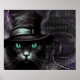 Black cat with green eyes and hat on gothic purple alcohol ink and argyle patterned background