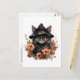 Postcard with a cute illustration. A black long-haired cat wearing a black witch's hat. It's ears poking out. Surrounded by orange and brown autumn flowers. Awesome design for witch themed items and Halloween.