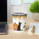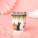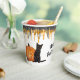 This fun Halloween party paper cup features a black cat sitting next to a glowing Jack o' lantern. At the top of the cup are faux glittery black and orange drips. The cat and Jack o' lantern image are repeated twice, with black text in between that says "Happy Halloween". The text may be easily changed to anything else you'd prefer. *The glitter is simulated; no actual glitter is used in the product.