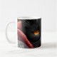 Black cat laying in front of a fireplace coffee mug