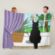 Black Cat sitting on window countertop looking out the window at the birds in the bird feeder. HD t.v. for cats