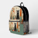 Fun backpack with a vintage,mid century modern design. There is a sleek black cat sitting on a shelf with MCM vases and flowers.