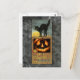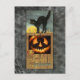 Black cat on a wooden fence with pumpkin postcard