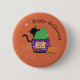 Cute black cat with a sweet tooth orange Halloween button . Also available in blue .