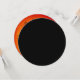 Scary black cat with orange eyes in front of a big, full, orange moon.