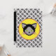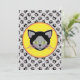 This easy to customise Halloween party invitation is decorated on the front and back with a pattern of black cats and a cat face graphic set against a full moon like yellow circle on the front.