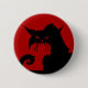 A black cat with spiky fur and piercing red eyes sits against a deep red background. Its eyes seem to glow, adding an eerie, supernatural quality to its already mysterious appearance.
