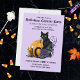 A black cat, purple rose, pumpkin and candle halloween party invite