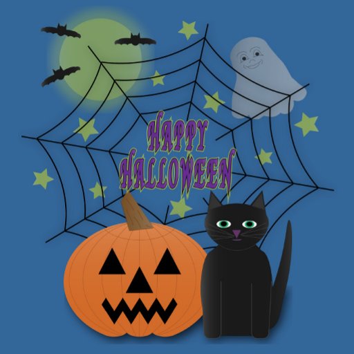 Celebrate spooky season with this charming Halloween illustration featuring a classic jack-o'-lantern, a wide-eyed black cat, a friendly ghost, and bats flying under a glowing moon. A bold spider web frames the festive "Happy Halloween" greeting in eerie purple and gold, surrounded by golden stars for extra sparkle. This playful, family-friendly design is perfect for stickers, T-shirts, tote bags, and more Halloween merch. Whether you're decorating for a party or gifting a Halloween fan, this cute and spooky design is sure to bring smiles!