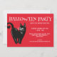 Black Cat Halloween party invitation featuring a black cat pattern on a white background on the back of the card and cat on a red background on the front. Customise with your details, change the text colour or leave as shown here to create your very own fun invitation. Spread the word about your spooky halloween bash! Please browse the Halloween Party Invitation Collection for more designs.