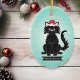 Cute, fluffy, black cat graphic with blue eyes, wearing a red/white Santa hat for Christmas. Black banner to add a custom pet name underneath. Aqua green striped background.