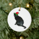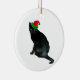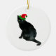 A black cat wears a red and green Santa cap this cute holiday ornament.
