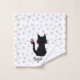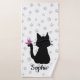 Enjoy this cute bath towel set featuring a whimsical black kitty cat silhouette with a pink butterfly on its tail over a light grey paw printed background. Personalise it with the provided name template, change the white background colour to your favourite!