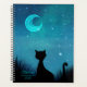 black cat looks at the crescent moon in a beautiful starry sky, with black and turquoise colours, and a personalised name, year.