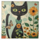Black cat, sunflowers, butterflies, flower pots, like native art, whimsical, watercolor with abstract ethnic, organic natural elements.