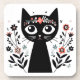 Vintage black folk cat design with big eyes surrounded by flowers