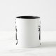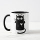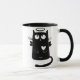 A black angel cat with wings and a halo, with its heart visible. Printed on a black and white mug.