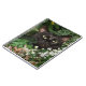 Black cat looks out from the daisy like wildflowers he's snuggled in with photo notebook