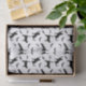Simple black silhouette pattern of cat and bat silhouettes. One cat is stretching, another is just standing while a third one is reaching towards a flying bat. This design has a modern Halloween aesthetic for those who enjoy a minimal and stylish seasonal look.