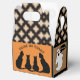 Traditional meets Gothic with this Halloween themed Favour Box. The four side panels have a traditional flair starting with the front and back. There's an orange background with the silhouette of four black cats. The text, which reads, TRICK OR TREAT, can be customised. On the two side panels there is a ghost on a brown background. The top half of the box has a dark brown and beige, diamond pattern with a gothic touch.