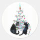 Three black cats decorate a Christmas tree. Use this cute cat sticker on your holiday cards.