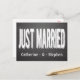 This wedding post card features a large Just Married announcement in a fun white chalk font highlighted against a black chalkboard background. The card can be personalised with the names of the bride and groom.