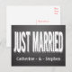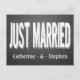 This wedding post card features a large Just Married announcement in a fun white chalk font highlighted against a black chalkboard background. The card can be personalised with the names of the bride and groom.