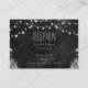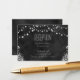 String of Lights Chalkboard © Sunny Mars Designs. Stylish, modern, elegant, classy, trendy, chic customisable formal or cute casual 3.5" x 2.5" wedding reception enclosure cards with a beautiful black chalkboard design featuring bulbs of rope or string lights hanging above with a floral tropical design below.