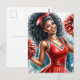 This postcard features watercolor artwork of a beautiful brown-skinned cheerleader in red cheer uniform with pompoms and a big, pretty smile!