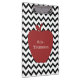 A clipboard for teachers featuring a black and white chevron pattern. Front features a red apple illustration. Personalise with your name on apple.