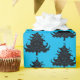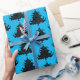 Black and blue Christmas trees pattern quality wrapping paper. Heavy duty quality gift wrapping paper on a roll - you choose the length! A pattern of black pine trees, and blue swirls, is the design. Contemporary holiday design.