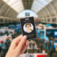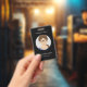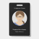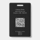 A Minimalist employee badge on a black background with a circle photo frame for company, small business, festival, press staff, etc. It comes with company name, employee's name, job or service on the front. On the back, you have a QR Code, 2 customisable text zones.