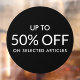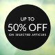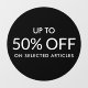 Sale window cling with white, customisable text "up to 50% off on selected articles" on a black circle background. You can change the percentage in the template field and background colour with the design tool.